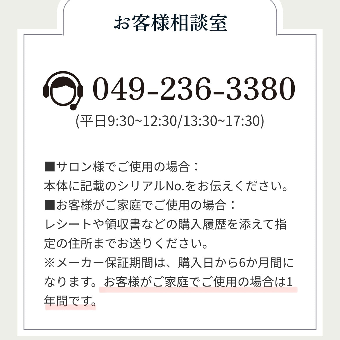 また、商品付属の保証書には保証期間6ヶ月と表記されておりますが、そちらは美容室で美容師さんが使用した場合の保証期間であり、一般家庭でのご使用であれば1年間の保証期間がございます。