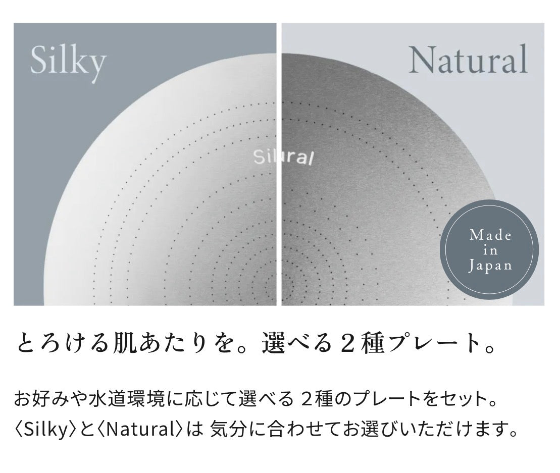 KINUJOには肌あたり滑らかなシルキープレートと、肌あたりはやや落ちるものの水圧が強く感じるナチュラルプレートの2種類がありますが、